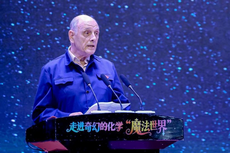 在随后的“化学魔法”课堂上,中国工合国际委员会副主席、北京化工大学科普实验中心主任、中国政府“友谊奖”获得者、英国籍化学专家戴伟教授针对高中生和小学、初中年龄段学生的不同特点,分别以“什么是化学反应”“化学无处不在”为题,为同学们带来了生动、奇妙的化学课程。