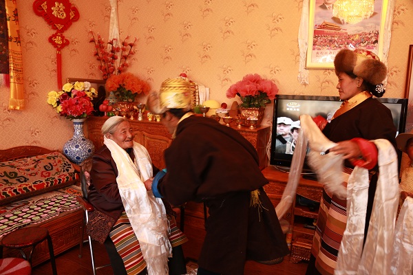 “穷棒子”互助组成员的后代们在过年时给次仁拉姆老人敬献哈达(2017年2月)
