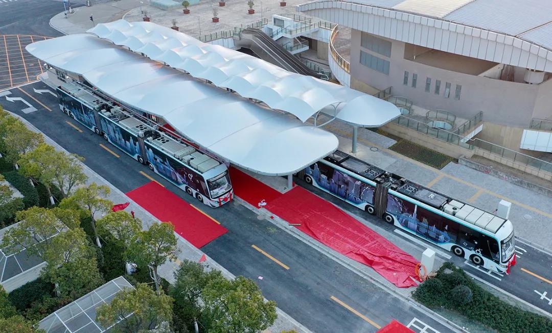 △ 上海临港新片区中运量T1示范线采用新一代清洁能源轨道电车,车身长度30米,车辆最高运营速度达70km/h,三编组单列车最大载客可达302人。该车是我国自主研制的世界首列数字轨道胶轮电车。列车采用了电磁导向虚拟轨道技术,使车辆定位更精准、更加安全可靠;车辆轴重7吨,道路适应性强,路面改造少;采用超级电容,单程续航超30公里,更加绿色环保、高效节能。(图源:东方IC)