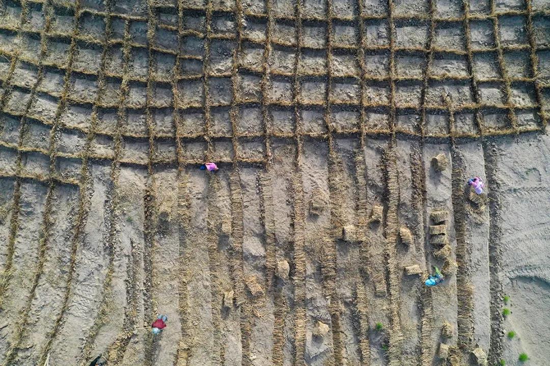 △ 2020年7月14日,在格库铁路新疆塔克拉玛干大沙漠若羌县段,施工队在格库铁路两边进行草方格固沙作业(无人机拍摄)。截至2020年7月14日,格库铁路新疆塔克拉玛干大沙漠段固沙防沙防护工程完成90%以上的工作任务。(图源:东方IC)
