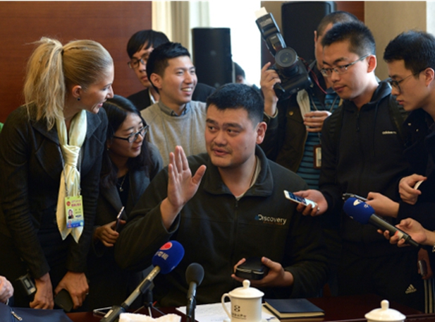 在全国政协十二届五次会议上,姚明委员接受记者采访 图/贾宁