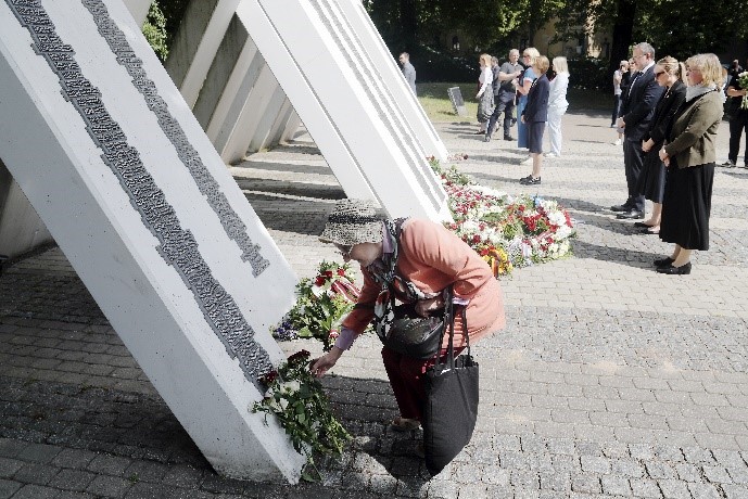 2025年7月4日,拉脱维亚里加,一名女子在犹太人大屠杀受害者纪念日期间,在纪念碑前献花