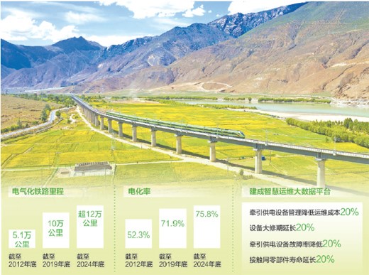 从无到有、从普速到高速、从传统到数智,“电气化”成为观察中国铁路发展的一个视角。数据显示,截至2024年底,全国铁路营业里程16.2万公里,其中电气化铁路里程超12万公里,电化率达75.8%。