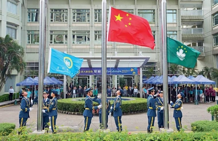 澳科大学子组成的国旗仪仗队正在进行升旗仪式