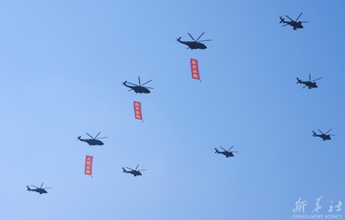 空中护旗梯队率先亮相,揭开阅兵分列式的序幕——3架直升机分别悬挂中国共产党党旗、中华人民共和国国旗、中国人民解放军军旗迎风向前,26架直升机组成巨大的“80”字样,3架直升机分别悬挂“正义必胜”“和平必胜”“人民必胜”条幅飞过天安门广场。
