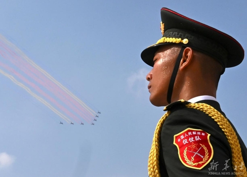 9月3日,纪念中国人民抗日战争暨世界反法西斯战争胜利80周年大会在北京隆重举行。这是空中护旗梯队通过天安门广场