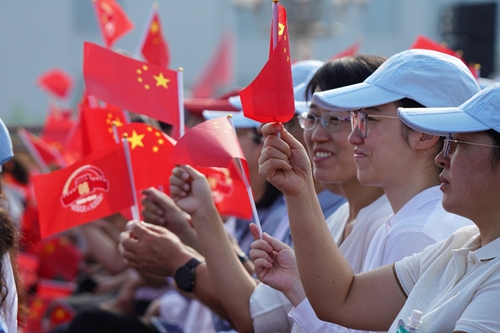 9月3日,纪念中国人民抗日战争暨世界反法西斯战争胜利80周年大会在北京隆重举行。这是观众在挥舞国旗