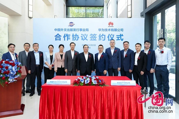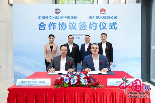2025年12月2日,中国外文局与华为签署合作协议。中国外文局局长常勃(后排左二),中国外文局副总编辑、当代中国与世界研究院院长李雅芳(后排左一),华为公司副总裁、ISP与传媒军团CEO岳坤(后排右二),华为中国政企大企业Marketing与解决方案销售部总经理肖雪岗(后排右一)出席活动并见证签约。中国外文局副局长余应福(前排左),华为中国政企大企业系统部总经理刘涛(前排右)分别代表双方签署协议。华为供图
