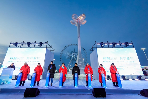 1月6日,“世界市长对话·哈尔滨”活动启幕仪式举行,嘉宾们点燃“雪韵丁香”火炬塔