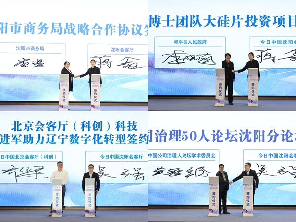 揭牌仪式后,现场还举行了多项战略合作签约。沈阳市商务局与沈阳会客厅签署战略合作协议,双方将共同构建政企协同、内外联动的长效合作机制;和平区人民政府与陶莹博士团队就大硅片投资项目签署合作意向,推动半导体材料领域的技术创新与产业落地;“中国公司治理50人论坛项目”与今日中国沈阳会客厅签署了项目合作签约仪式;北京会客厅(科创)与沈阳会客厅签署了助力辽宁数字化转型协议。这一系列合作充分展现了沈阳以优越的营商环境吸引高端资源集聚、推动产业创新的决心与成效。