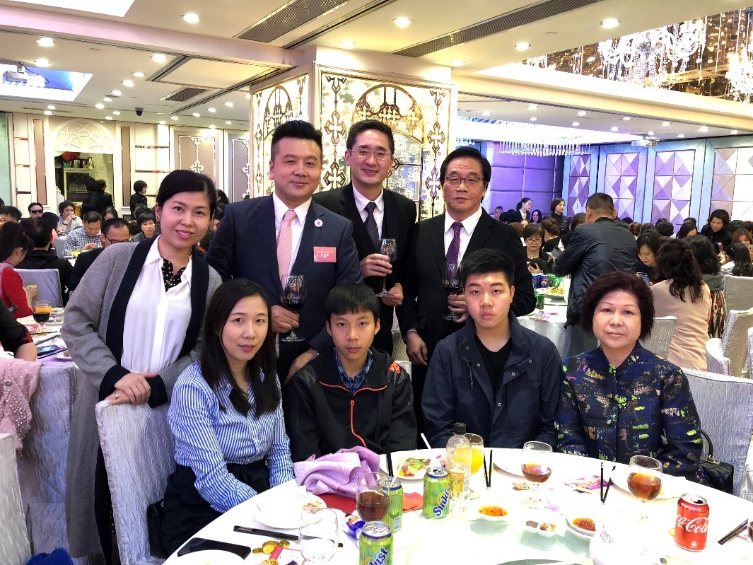 2019年3月28日,何永辉(后排左二)一家人参加香港广西南宁市同乡联谊会春茗晚会。