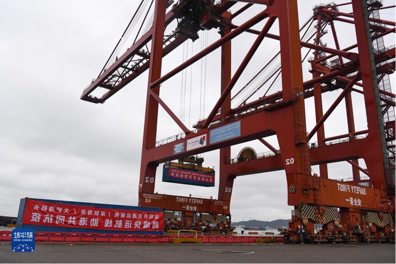 在深圳大铲湾码头,满载供港蔬菜、水果、鸡蛋的集装箱吊装上船(2022年2月21日摄)。新华社记者 梁旭 摄