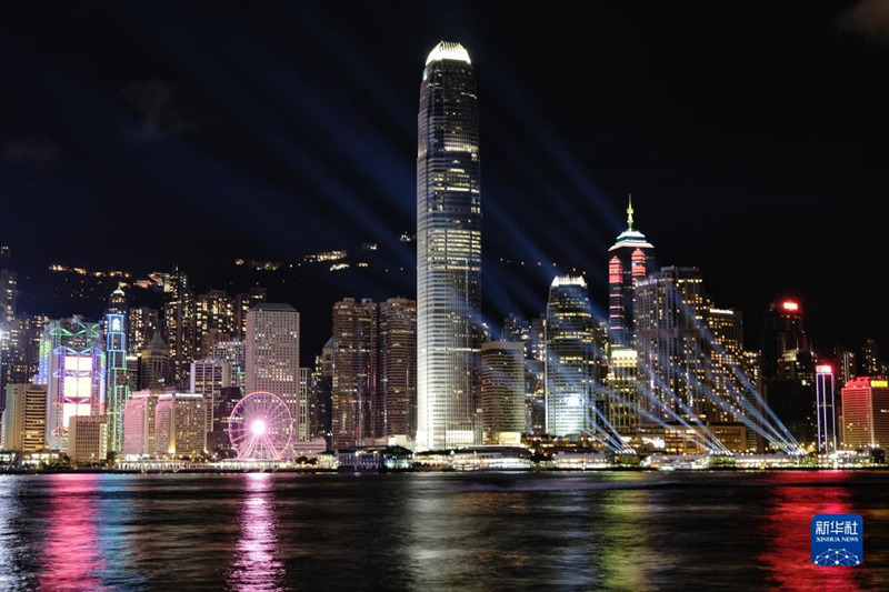 这是2022年6月25日在香港尖沙咀拍摄的香港岛灯光秀。新华社记者 王申 摄